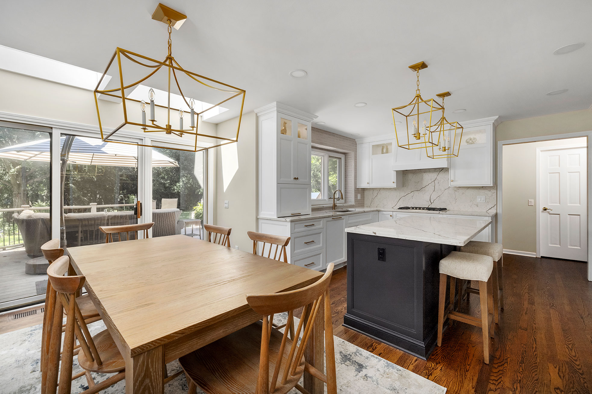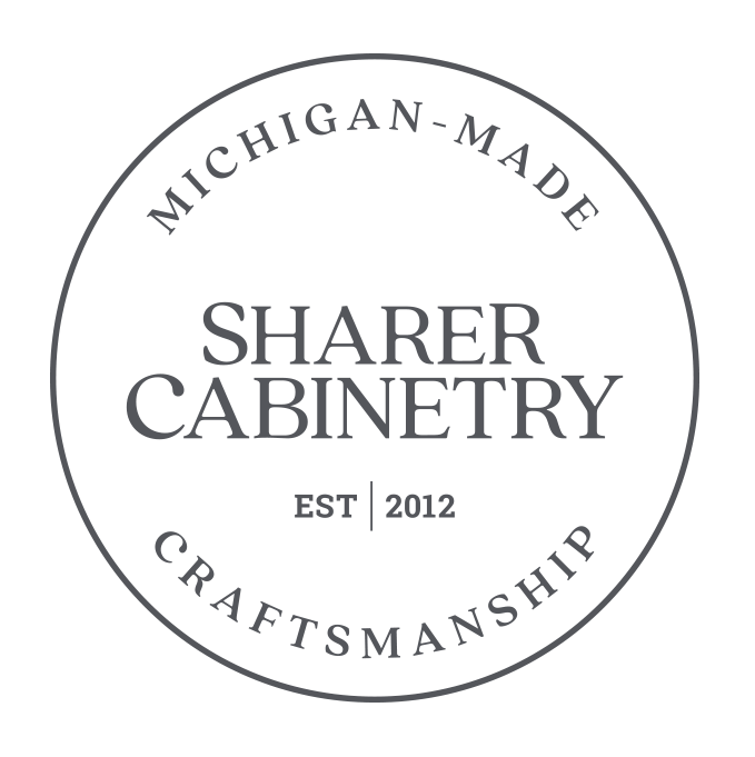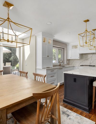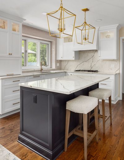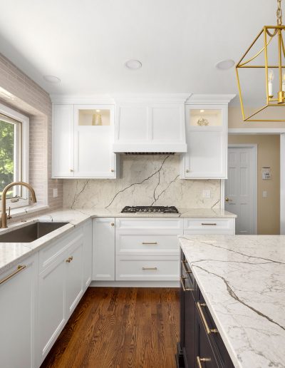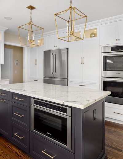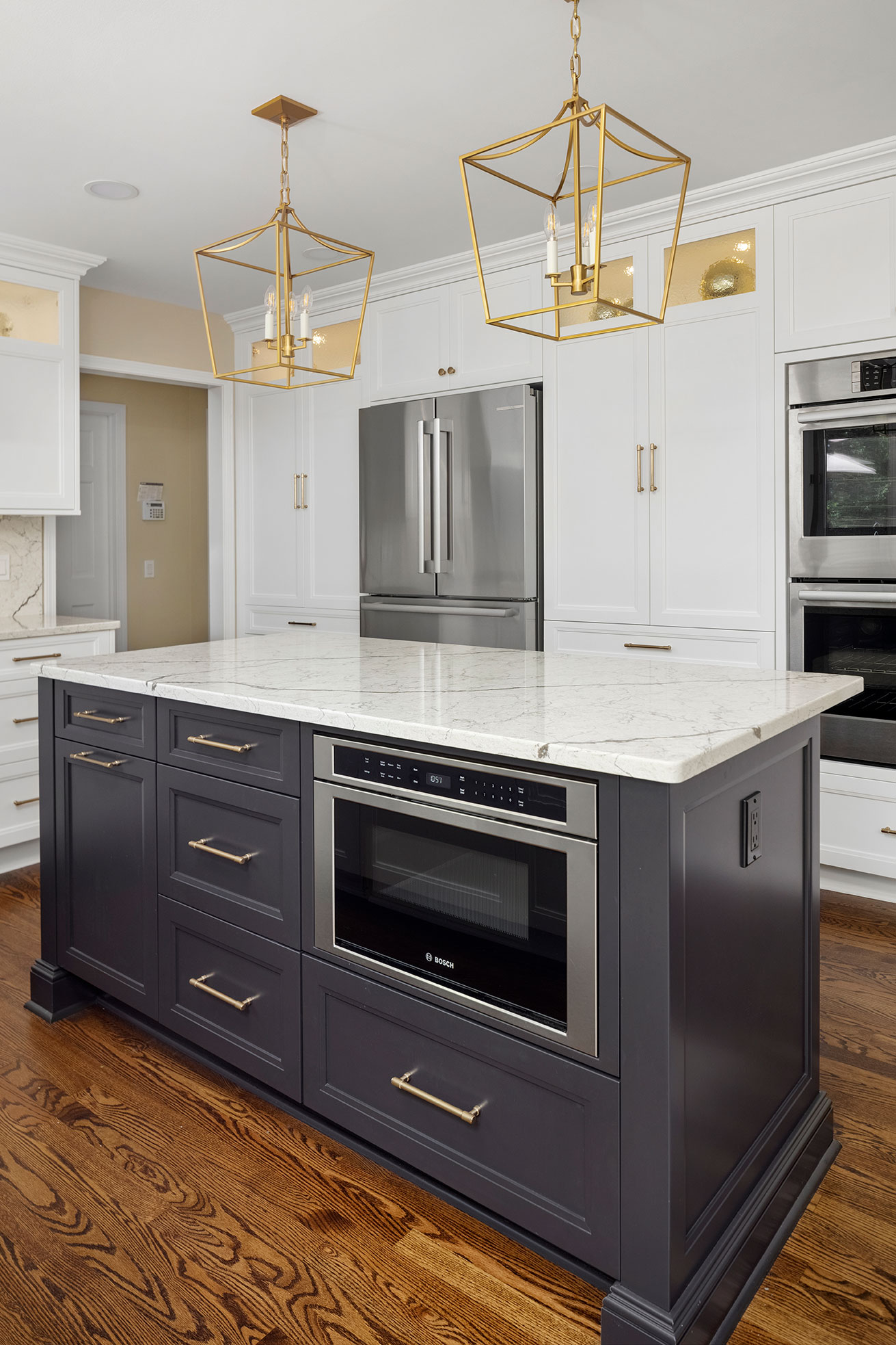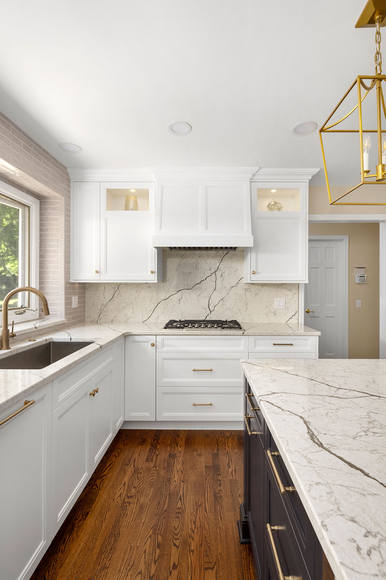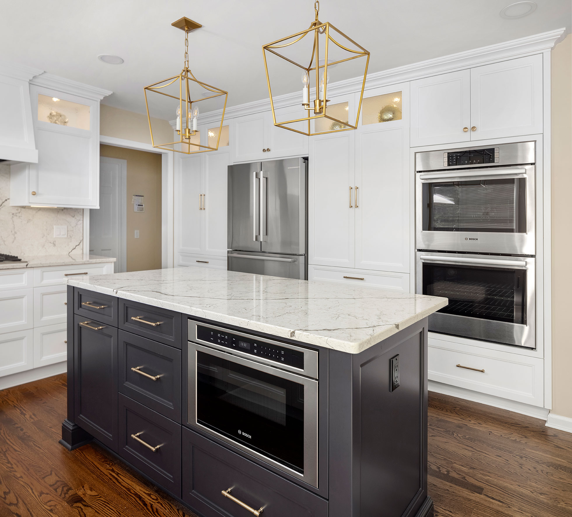 Sharer Cabinetry painted in white is offset by a darker tone center island featuring our obsidian custom paint color. A stunning quartz countertop and backsplash add a touch of drama while brushed brass fixtures round out the lux look.