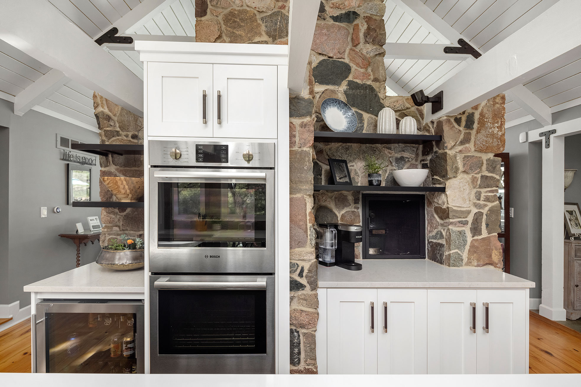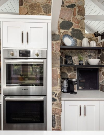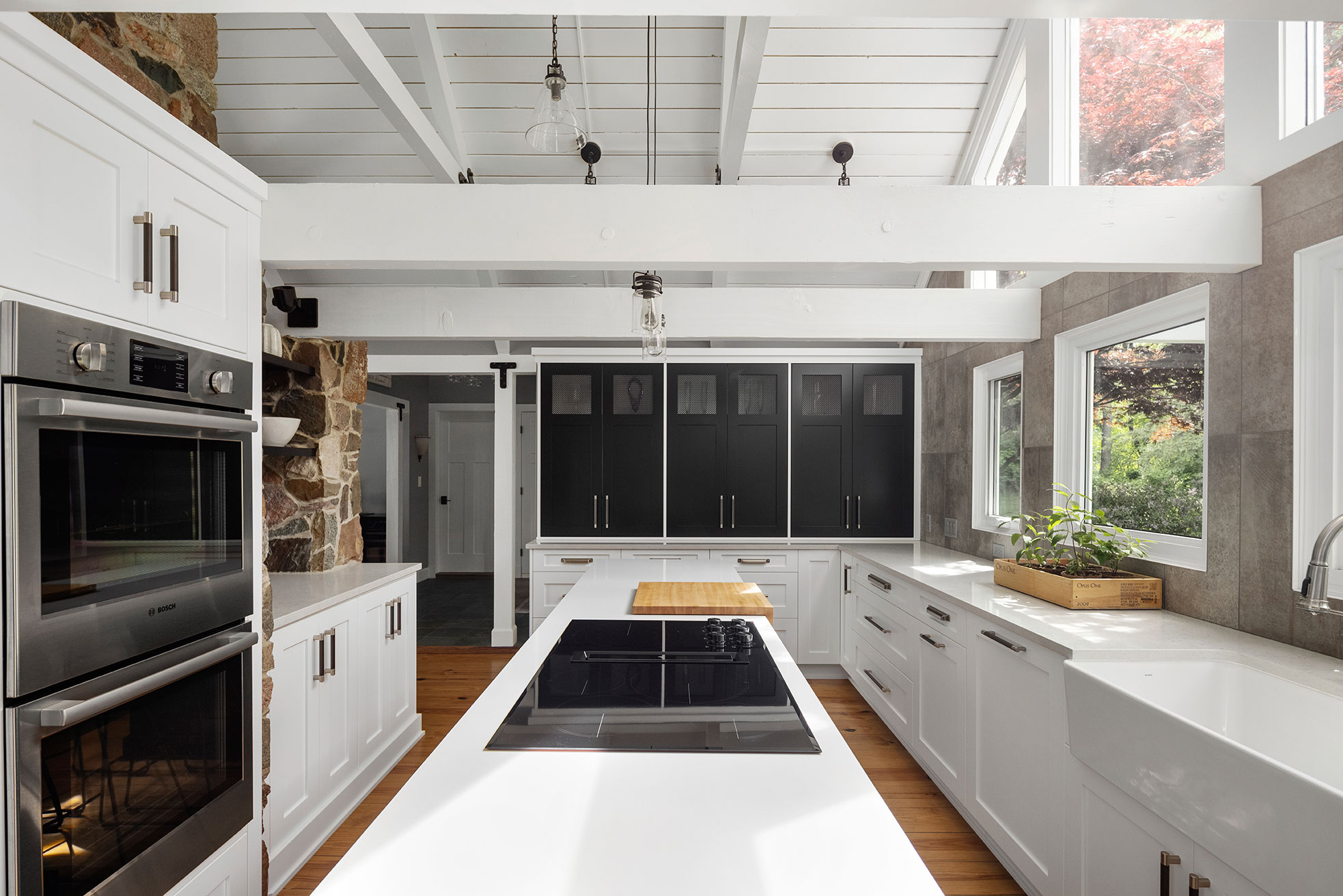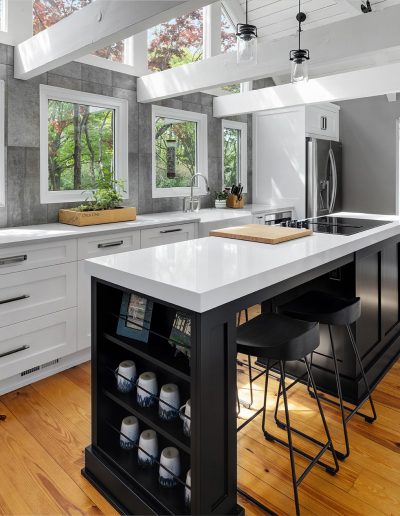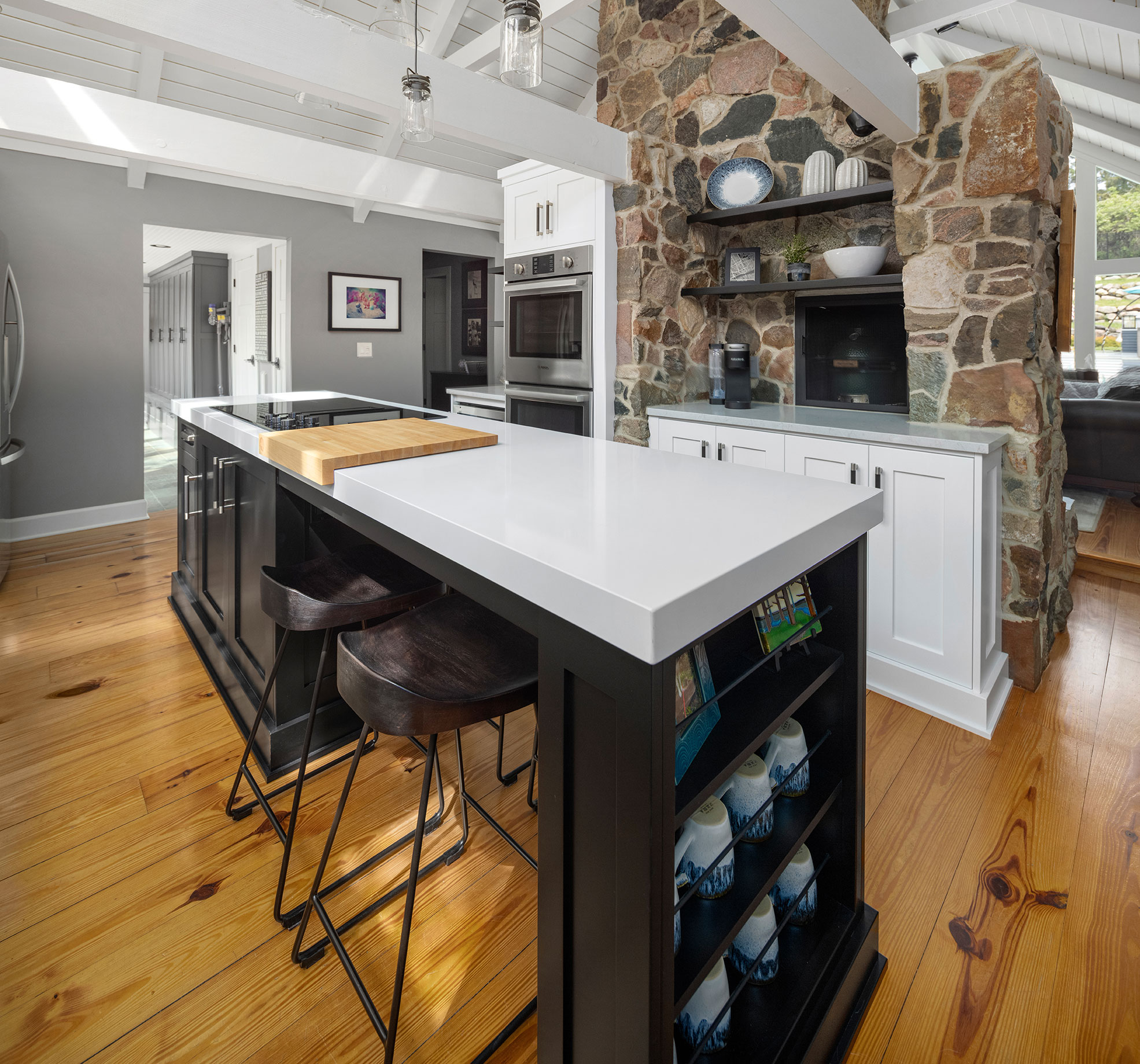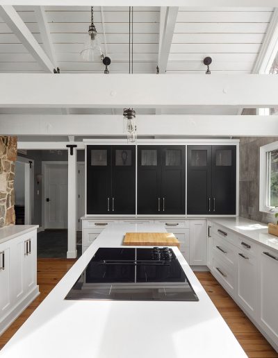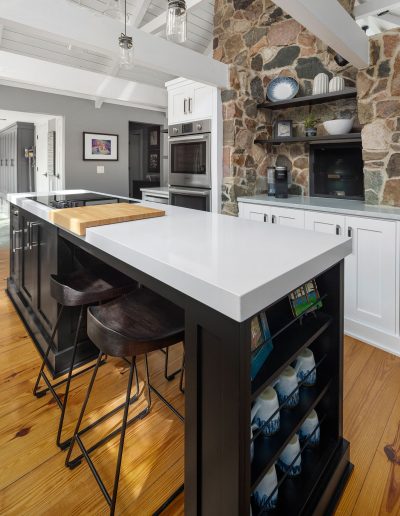 Character and details are the highlight of this stunning modern kitchen! Custom Sharer Cabinetry is featured in striking contrasts of black and white, with floating shelves added to the existing stone walls. The large center island offers abundant storage and serving options.