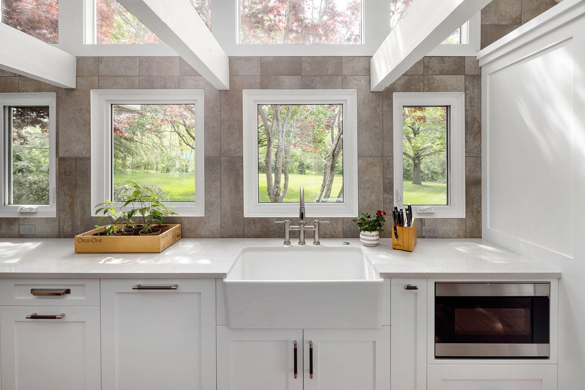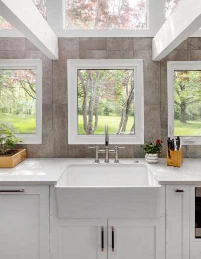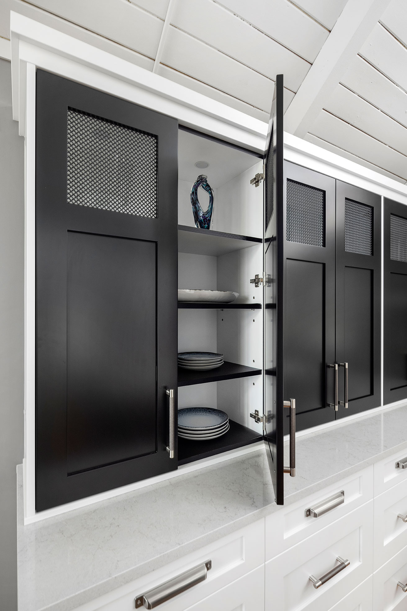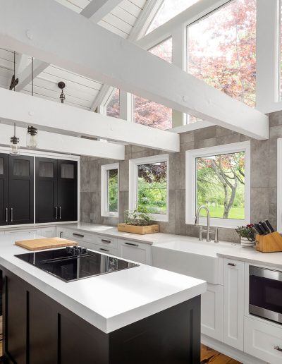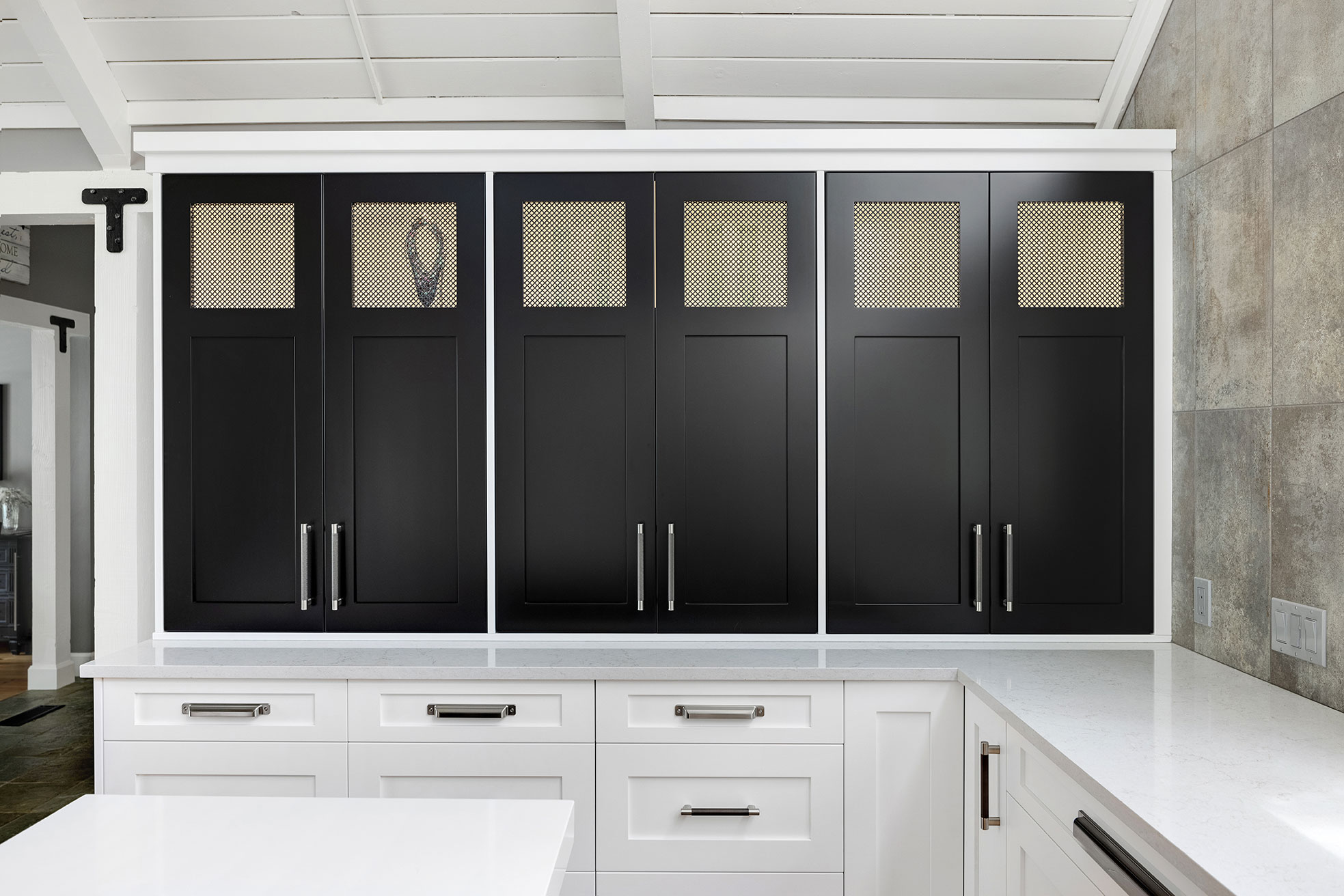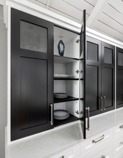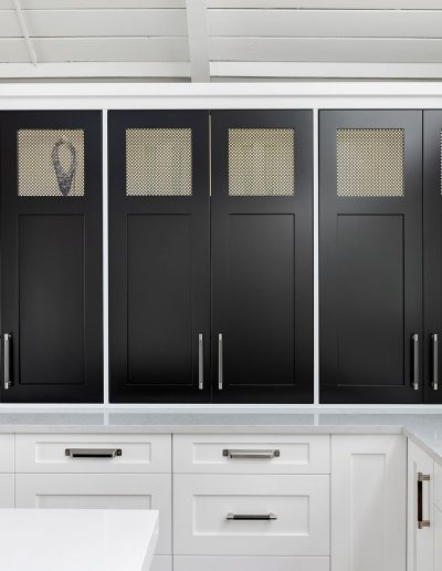 Character and details are the highlight of this stunning modern kitchen! Custom Sharer Cabinetry is featured in striking contrasts of black and white, with floating shelves added to the existing stone walls. The large center island offers abundant storage and serving options.