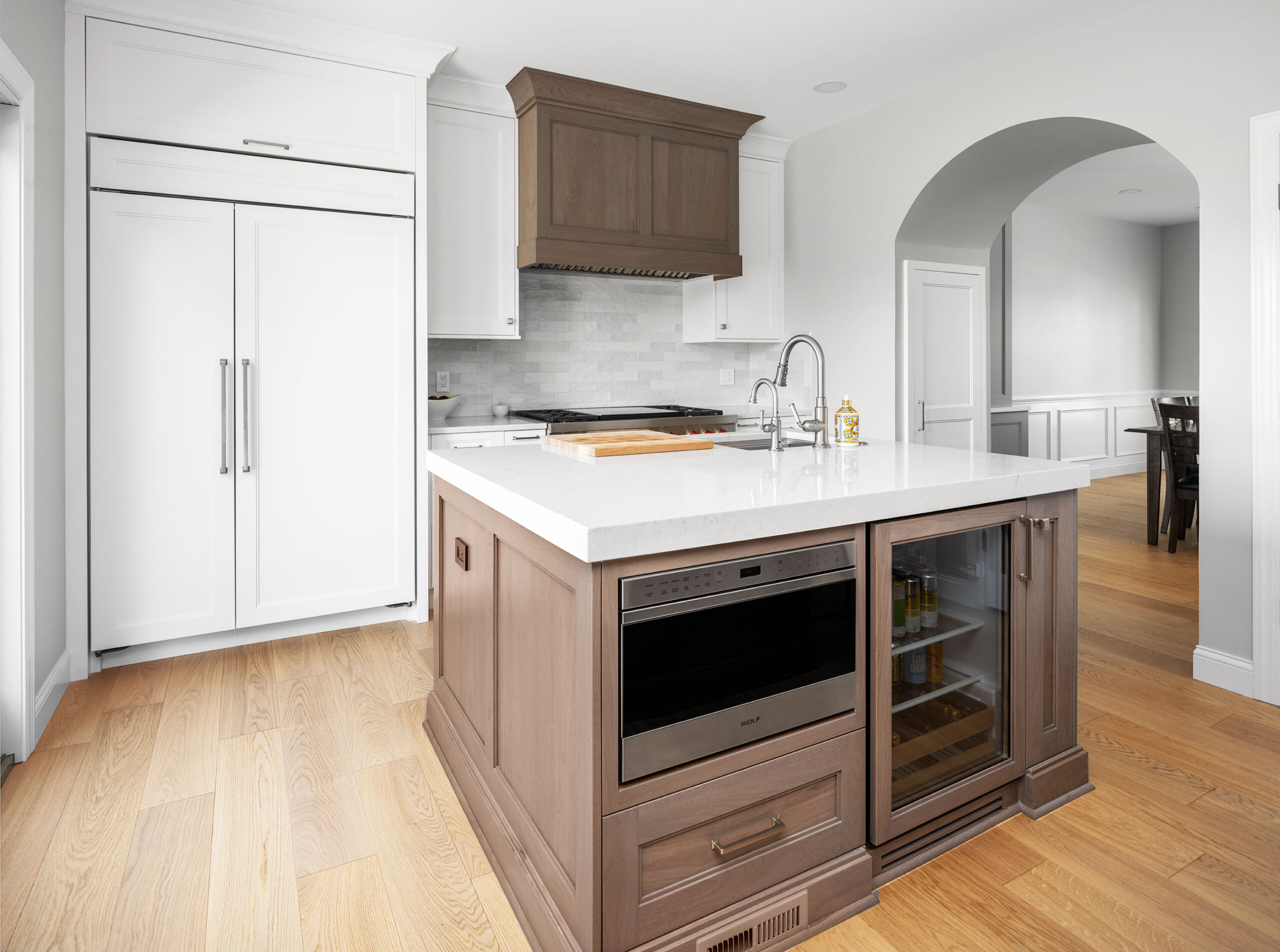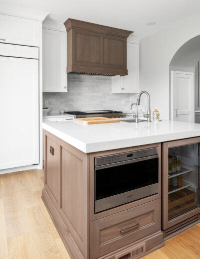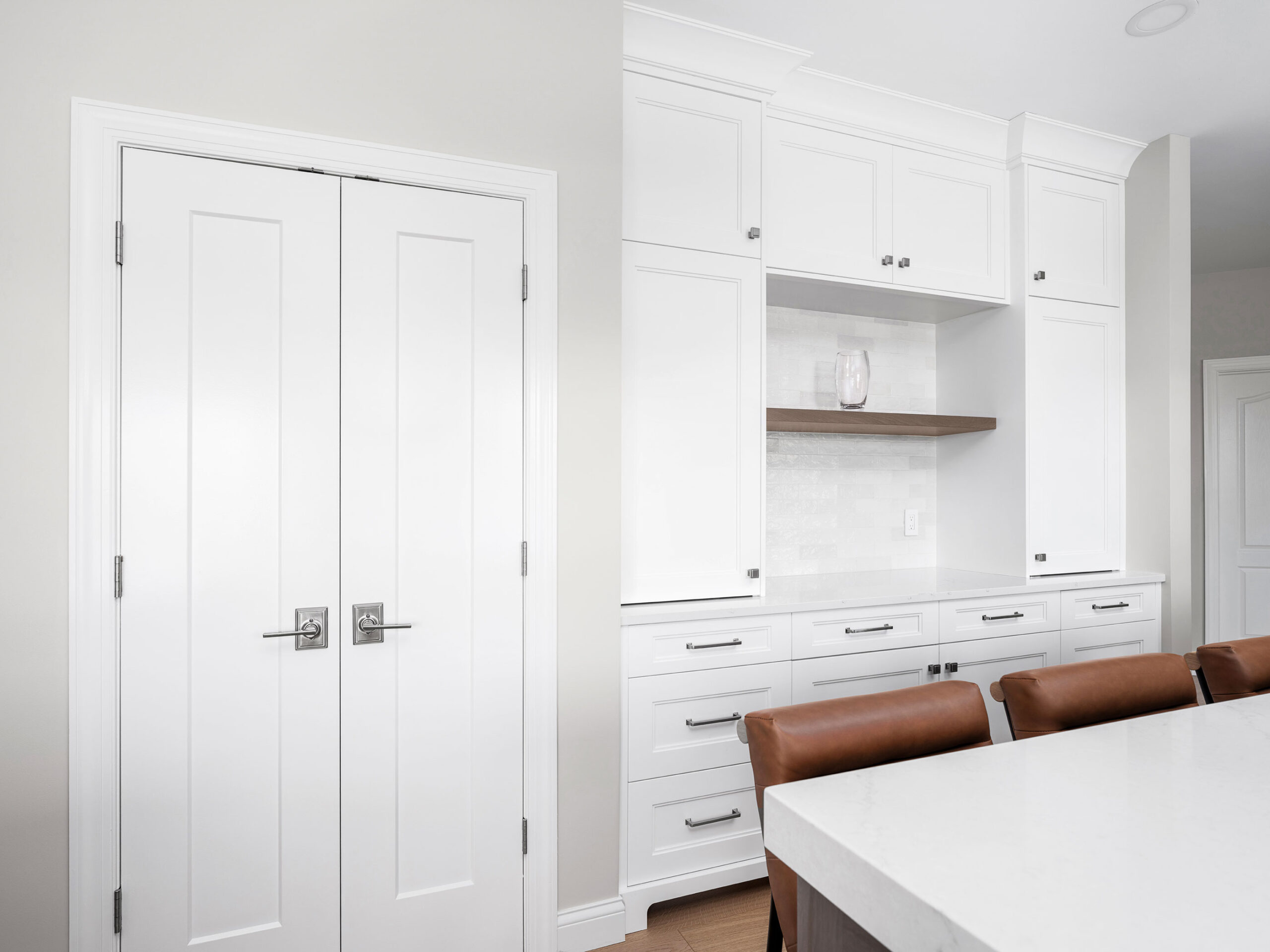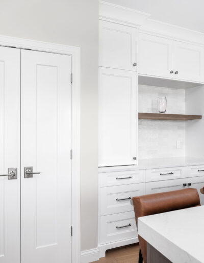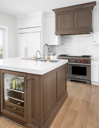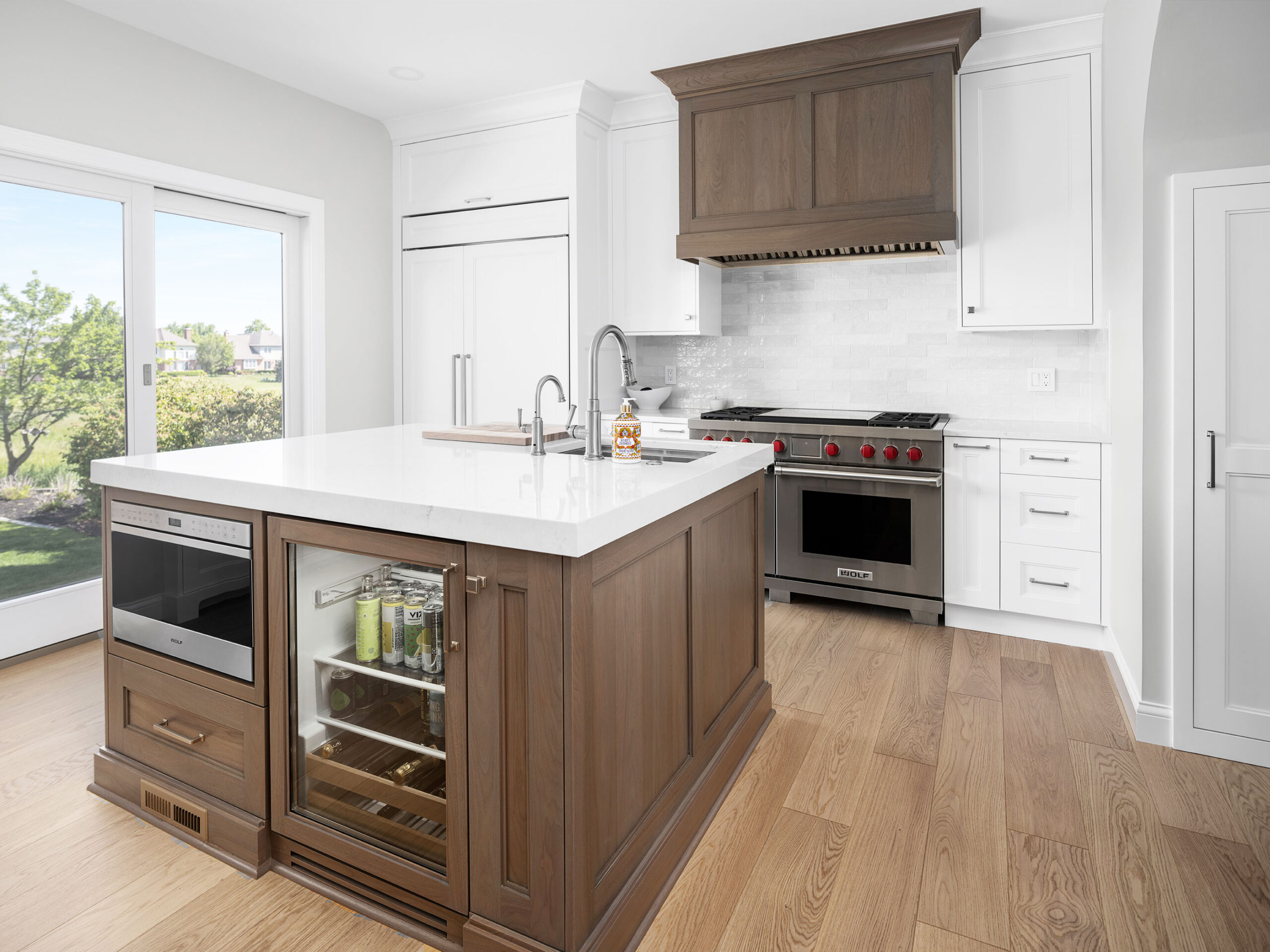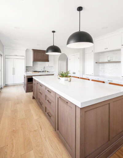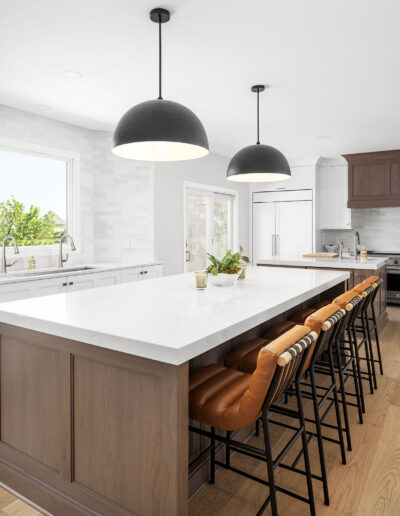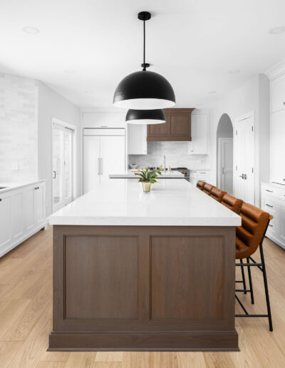 This bright and inviting kitchen blends timeless design with modern simplicity. Clean white cabinetry and soft tile textures are paired with warm wood tones on the island and range hood, creating a balanced and welcoming atmosphere. A generous island with leather-accented seating provides the perfect space for gathering, while oversized pendant lighting and expansive windows fill the room with natural light. The result is a kitchen that feels both fresh, functional, and effortlessly elegant.